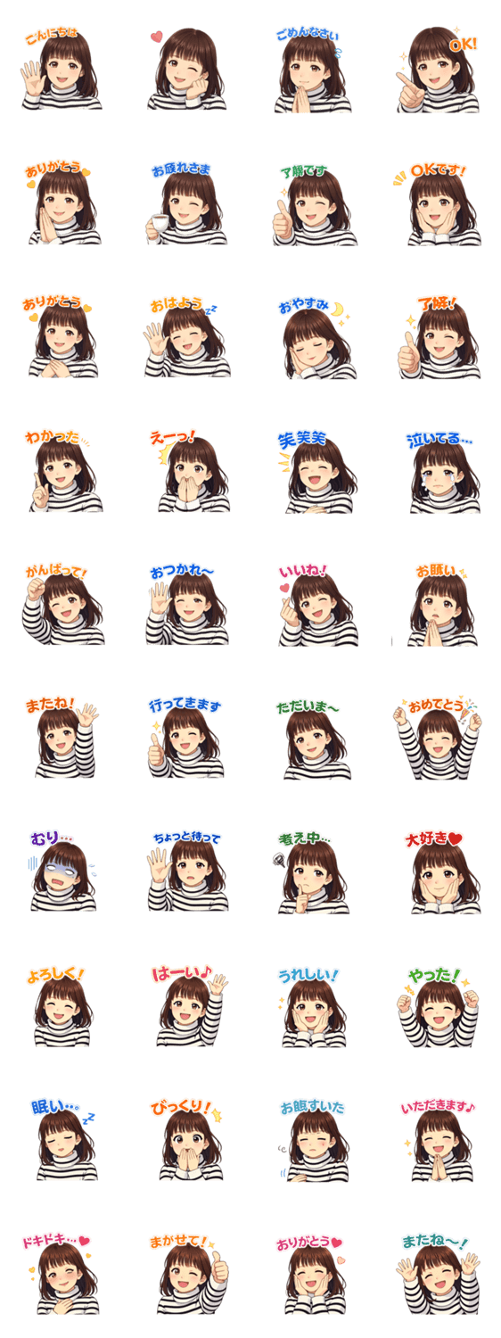 | スタンプ説明 | A cute girl in a striped top! 40 stickers perfect for everyday conversations including greetings and emotions. Enjoy using them with friends and family! |