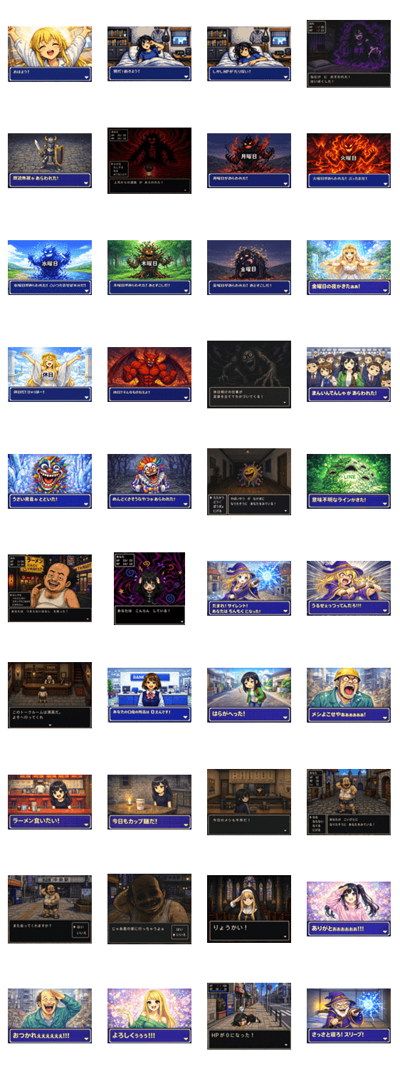 | スタンプ説明 | ドット風のレトロなRPG的な雰囲気のスタンプです。ロールプレイングゲーム、2D、ドット絵、面白い、毒舌、ネタ、ファンタジー、社会人、昭和、HP、ステータス。 |