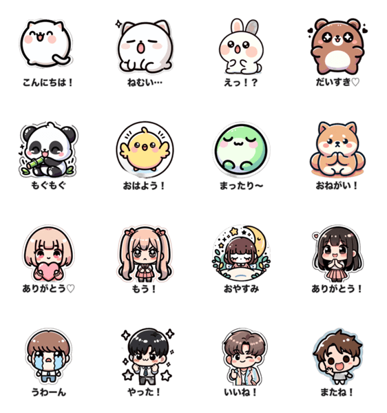 | スタンプ説明 | 動物と人間キャラクターの16種類のゆるかわいいスタンプです。猫・うさぎ・くま・パンダ・ひよこ・カエル・柴犬など、日常会話で使えるスタンプが揃っています。 |