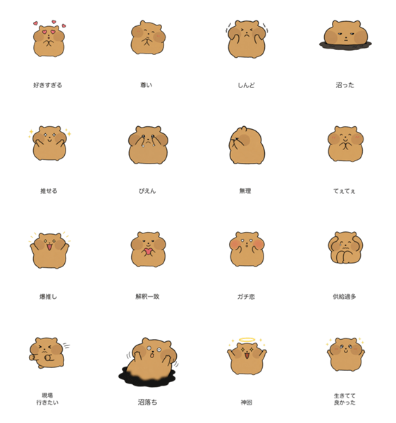 | スタンプ説明 | 好きすぎる、沼った、てぇてぇ、神回。推し活で情緒崩壊するハムスターの16枚。ガチ恋・現場・供給過多、全オタクの感情を代弁するヘタウマスタンプ。 |