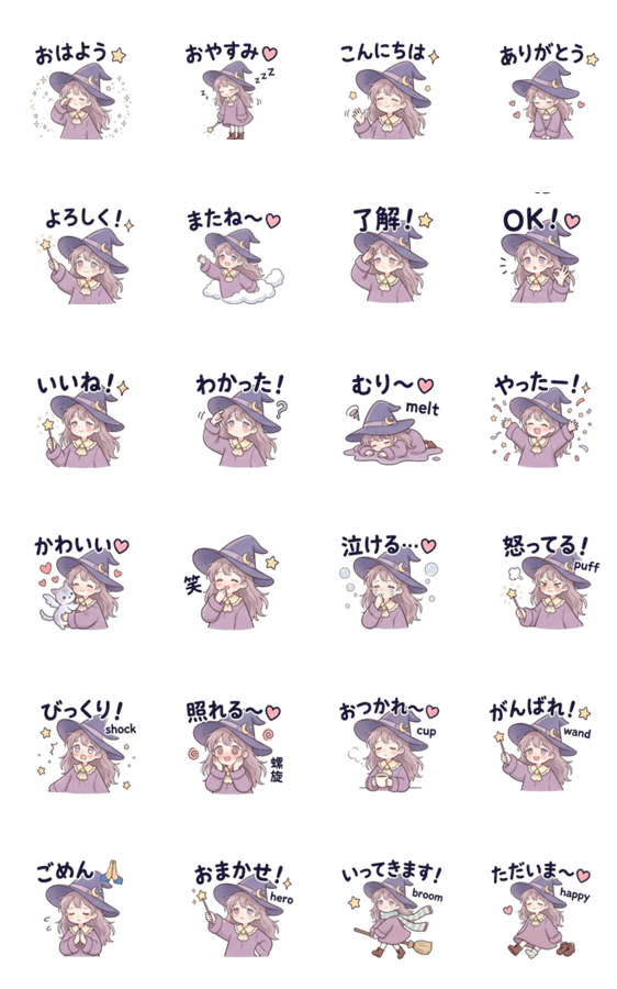 | スタンプ説明 | ふわふわ夢見がちな魔法使い見習いの女の子スタンプ。あいさつ・リアクション・感情など24種類。ほんわかかわいいイラストで毎日のトークを彩ります。 |