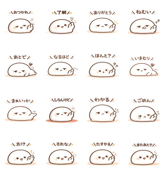 | スタンプ説明 | ゆるくて使いやすい、しろもちの脱力スタンプ。 「ありがとう」「ねむい」「わかる」など、毎日使えるひとことをふんわりまとめました。 |