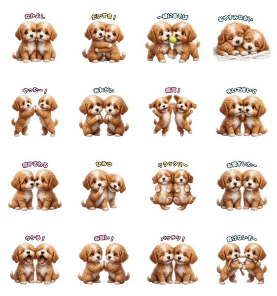 ビションフリーゼとプードルのミックス、ビションプーのスタンプ! ふわふわ感とつぶらな瞳がとってもキュート。 毎日のトークを可愛く盛り上げます!