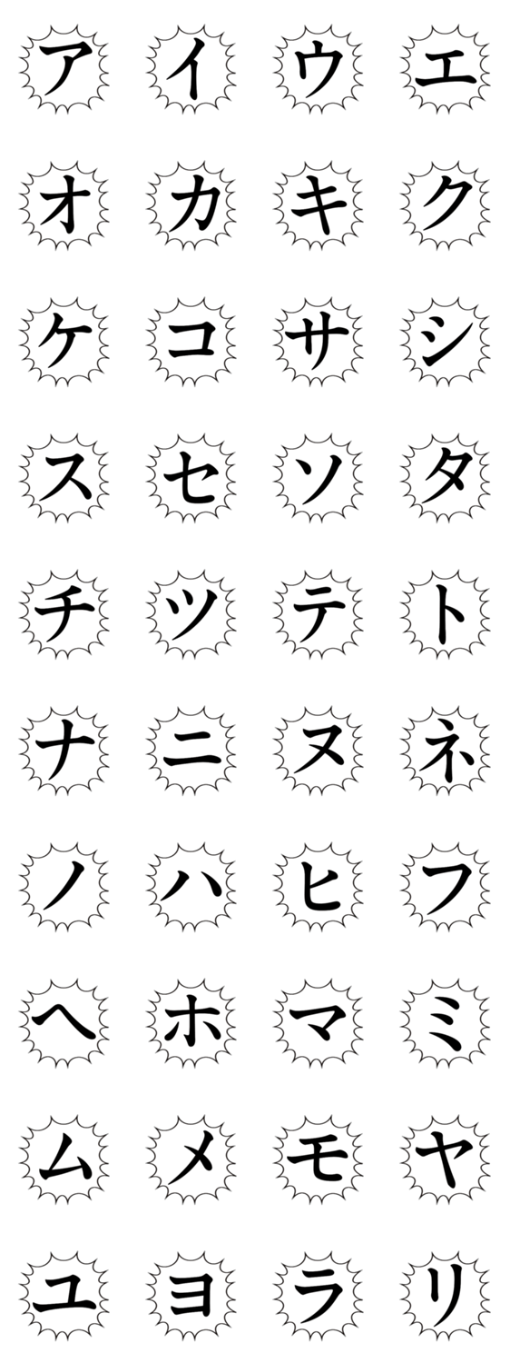 | スタンプ説明 | ア~リまでの片仮名スタンプです。50音順/漫画の吹き出し/アイウエオ・カキクケコ・サシスセソ・タチツテト・ナニヌネノ・ハヒフヘホ・マミムメモ・ヤユヨ・ラリ |
