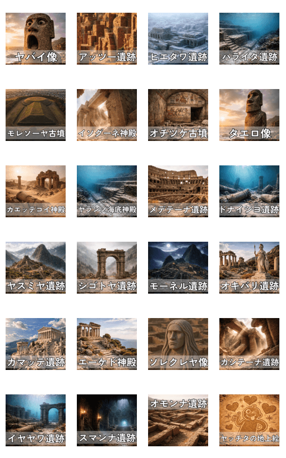 | スタンプ説明 | 架空遺跡スタンプ第5弾。 神殿や石像で日常会話やリアクションにも便利。 第1〜4弾も展開中。 ネタ シュール 関西弁 |