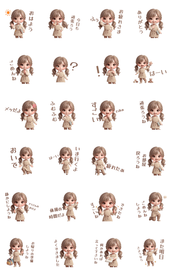 | スタンプ説明 | 3Dのぷにぷに質感がかわいい、オシャレ女子のお仕事日常スタンプです。恋人/カップル/ペア/友達/家族/挨拶/女の子/可愛い/お仕事シリーズ/職業/保育士/先生/幼稚園/保育園 |