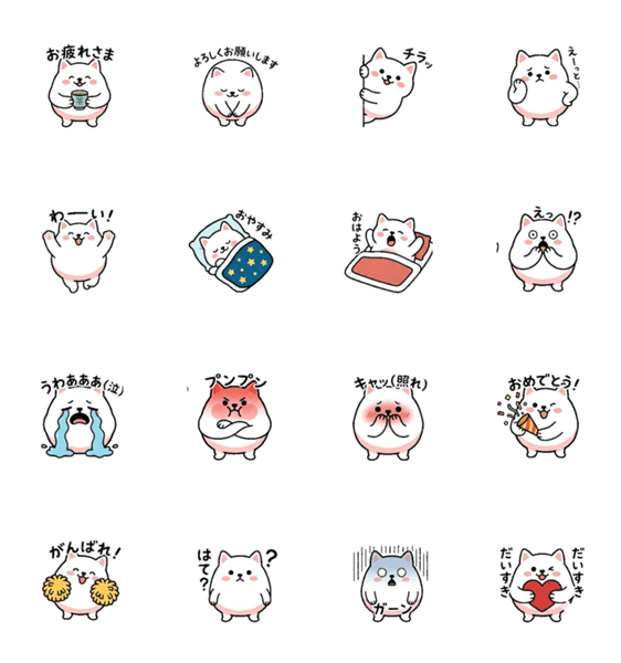 ふわまるなしろねこの日常スタンプ!おやすみ、わーい!、プンプンなど毎日使える16種を収録。友達・家族とのトークで大活躍します!