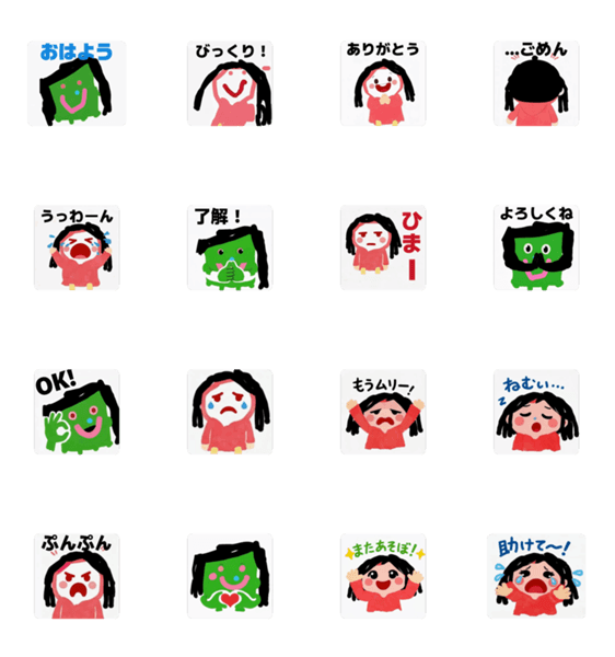 4歳児が描いた、ゆるい動くスタンプ。思わず笑顔になれちゃう。家族や友だちとの会話に、癒しを届けます。大人には描けない、自由で素直なかわいさがそのまま動き出す!