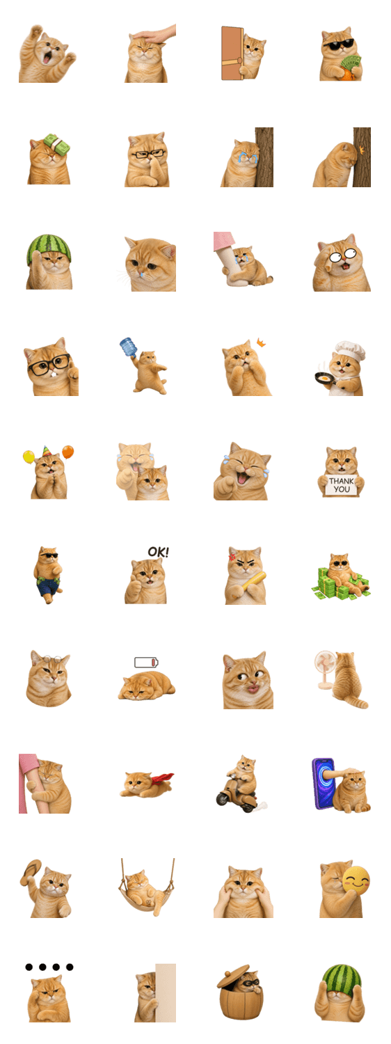 Cute chubby orange cat stickers with funny meme expressions for happy, sad, angry, sleepy, shocked, thank you, OK, and daily chats.
