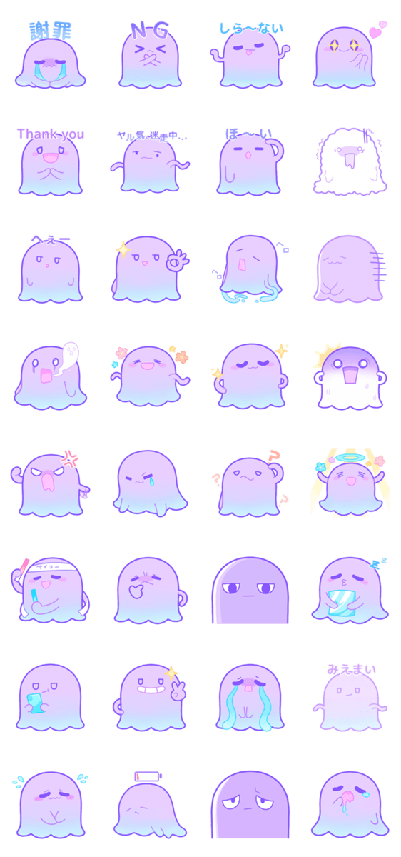 紫色の無気力なおばけ「だるだるおばけ」のスタンプです。