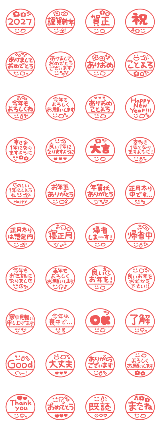 | スタンプ説明 | このスタンプは2026年の再販です。一つあると便利なポンッと押せるハンコ風のスタンプです。 シンプル/あいさつ/印鑑/スマイル/年末年始 |