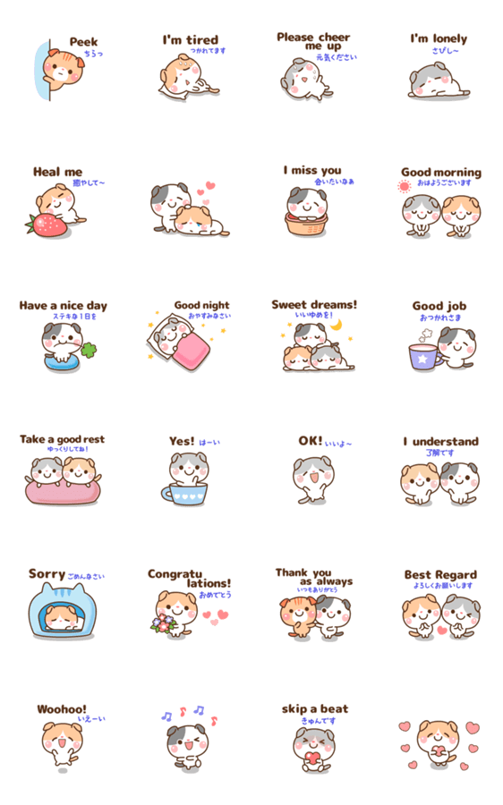 | スタンプ説明 | 「たれ耳ニャンコ」のずっと使える[ 英語&日本語 ]版スタンプです♪ 「甘える気持ち」と「よく使う言葉」を集めました♫ |