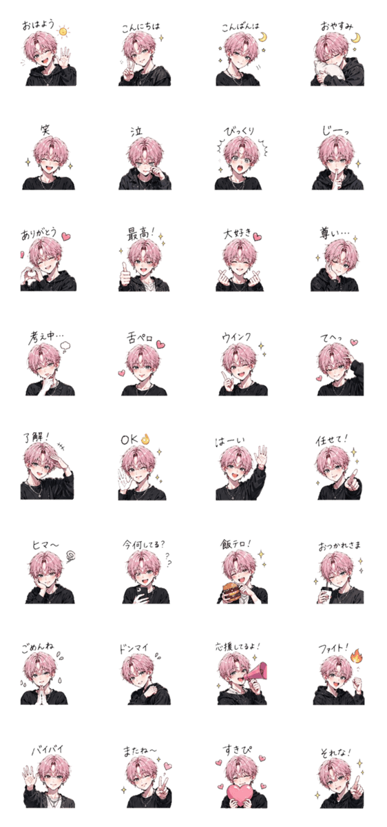 K-POPアイドルみたいなクールでキュートなピンク髪の男の子のスタンプセット!チャーミングな表情やポーズで、毎日のトークを明るく楽しくしてくれます♪