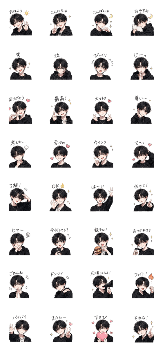 K-POPアイドルみたいなクールでキュートな黒髪の男の子のスタンプセット!チャーミングな表情やポーズで、毎日のトークを明るく楽しくしてくれます♪