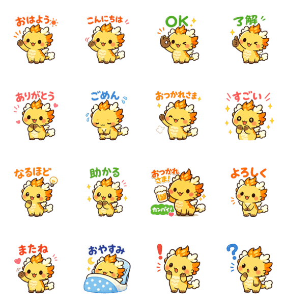 | スタンプ説明 | 麒麟をイメージしたデフォルメ子ドラゴンになります。日常のあいさつやかんたんな返事を楽しくしてくれますので、ちょっとしたやり取りにどうぞ。 |