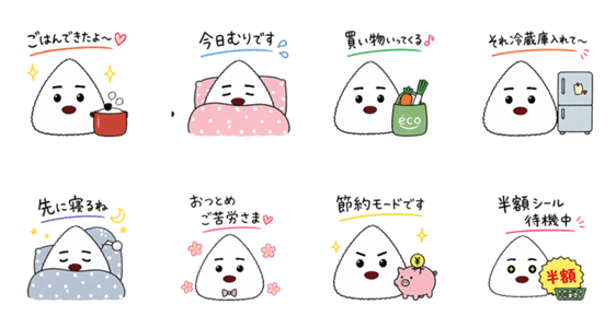 「ごはんできたよ〜♡」「半額シール待機中」…忙しい主婦の日常あるあるを、ゆるかわおにぎりが代弁!家族・ママ友・パートナーとのトークで共感される8種セットです