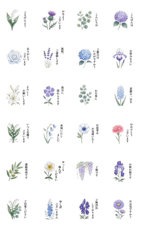 | スタンプ説明 | 水彩タッチで描いた草花と、日常でよく使う挨拶・敬語を組み合わせました。やさしい色合いの花々が言葉を引き立てます。大人の女性に贈りたい、上品なスタンプセットです。 |