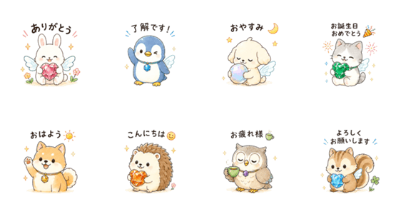 かわいい動物たちが宝石を持って気持ちを伝えるスタンプ。「ありがとう」「おやすみ」など毎日使える言葉をまとめました。やさしい雰囲気で日々のトークに寄り添います。