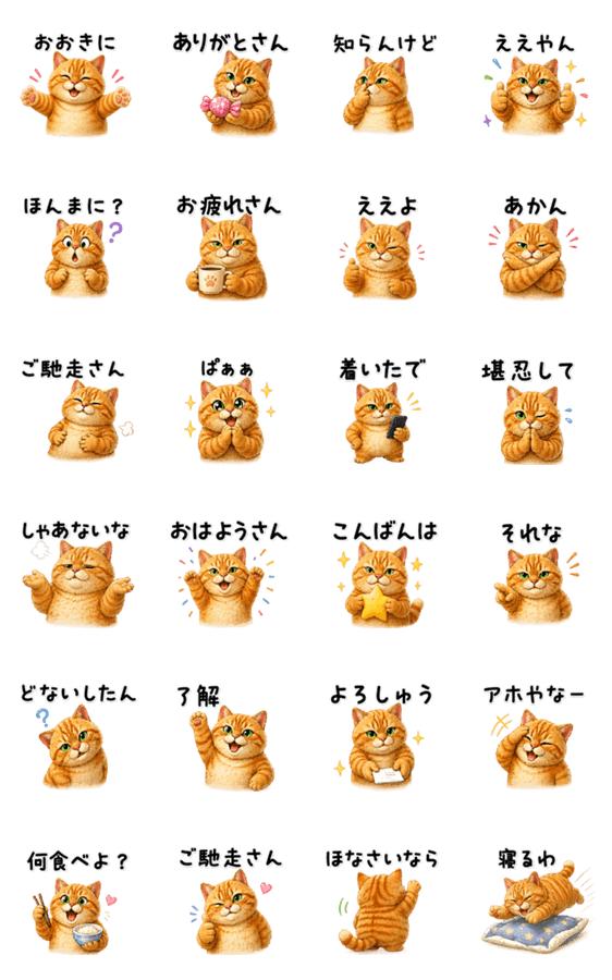 関西弁でゆるく気持ちを伝える、ねこのスタンプです。日常で使いやすいあいさつをそろえました。