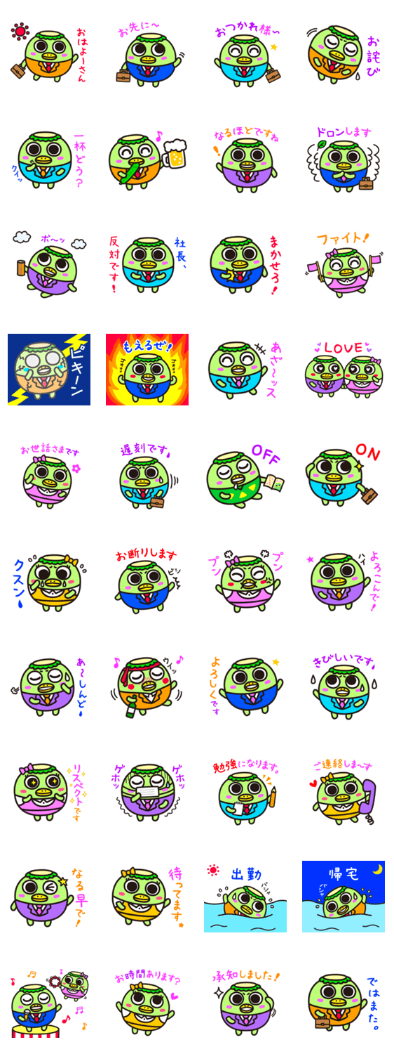 サラリーマンとして働くカッパのスタンプです。様々なビジネスシーンをカッパで表現しました。