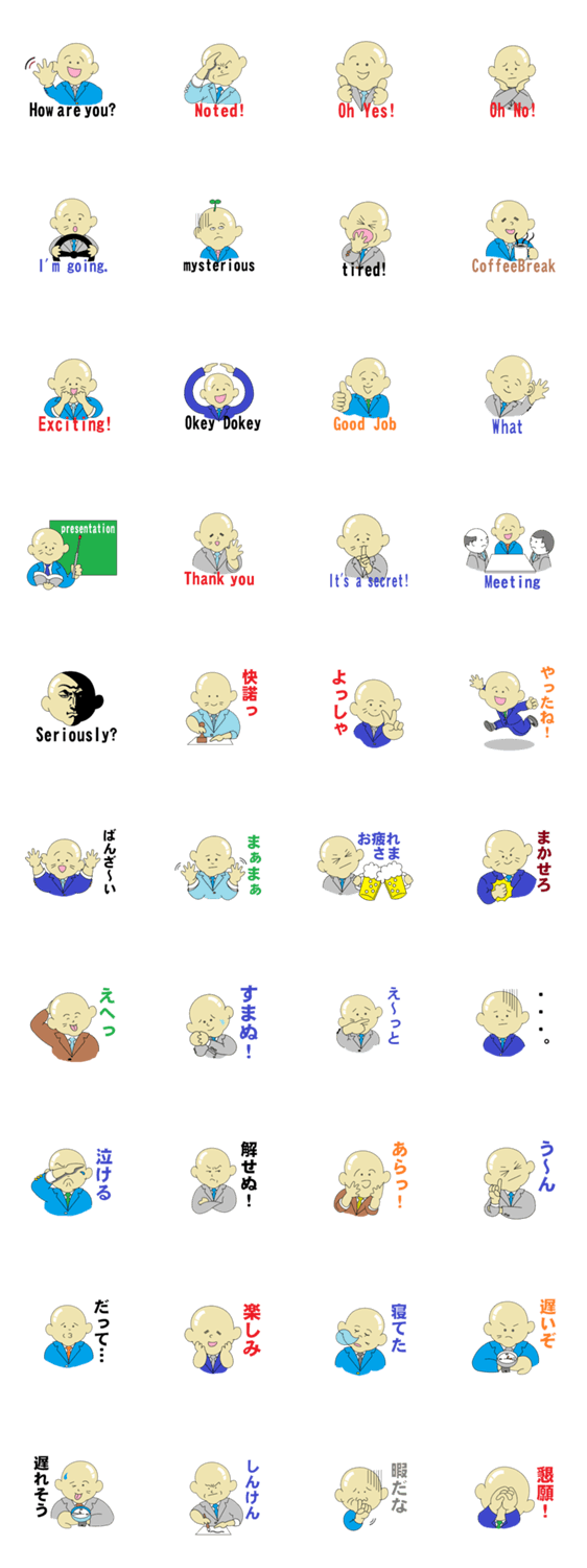 人気者の「つるはげ君」がサラリーマンになって再登場。前回の「つるはげ君」をより可愛いキャラクターにし、お仕事などのシーンで使用する言葉をスタンプにしました。