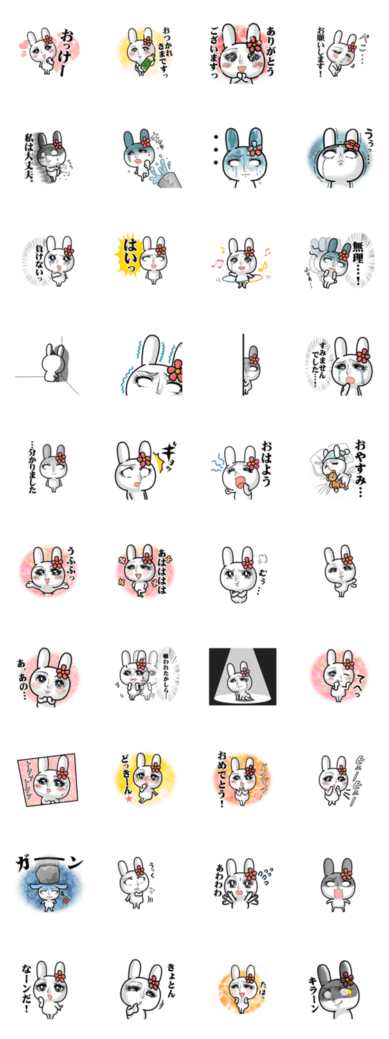 | スタンプ説明 | 逆境でもめげずにひたむきにがんばるウサギがあなたの気持ちを伝えてくれます。 |