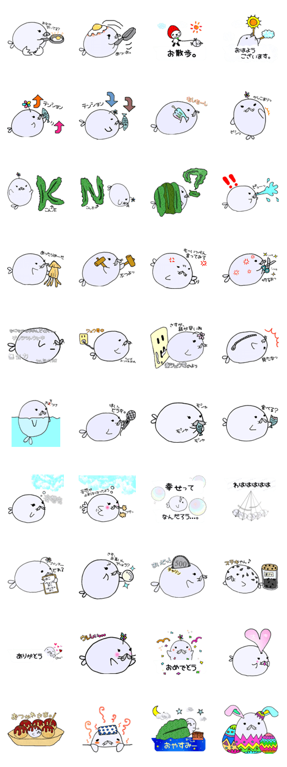 アザラシって何色?迷いに迷って薄ムラサキになりました...それでもアザラシなの。 吹き出しスタンプもあるよ(ノ´∀`)ノ♪ イースターエッグもこっそり入ってます。
