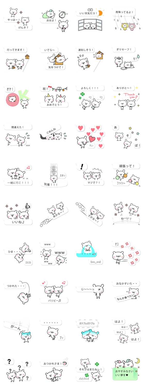 日常会話多めの、うさぎとくまのふきだしスタンプです。文字も、スタンプも使いたい人は、これ1つで済みますよ。白以外の背景で使ってくださいね。