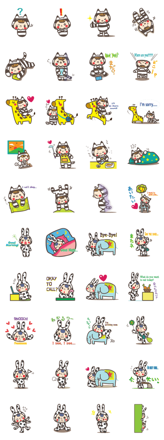 寂しがり屋のボーダー猫と、しっかり者のドットウサギの可愛くて楽しいスタンプ。いつもそばにいてくれる、キリンさんと、ゾウさんもヨロシクです。