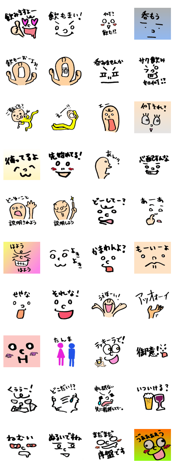 お酒は弱い方なのに飲みたがる人、お酒好きで1人でもよく飲む人、色々いると思います。ただ、誰かと飲みたい時や、お酒が入った時にこのスタンプを活用してほしいです。