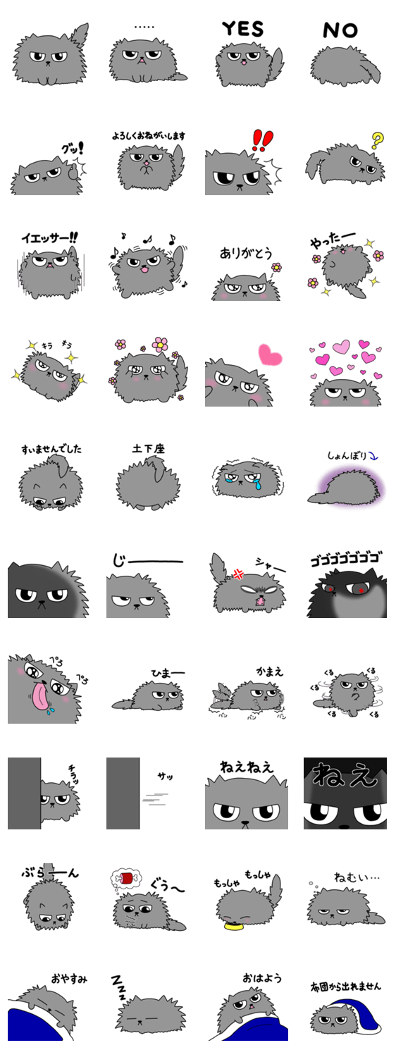 目つきは悪いけど怒っているわけじゃない、ふわふわもこもこまんまるペルシャ系猫の日常で使えるスタンプです。