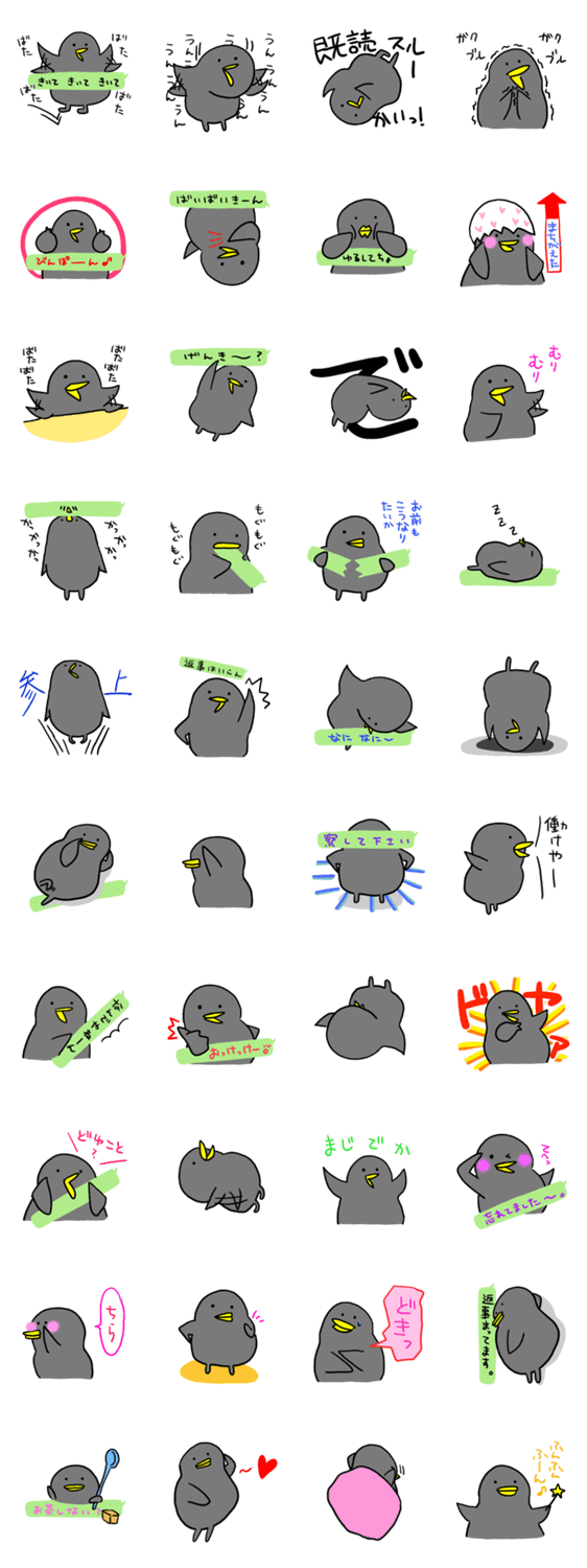| スタンプ説明 | ふきだしでわいわいわちゃわちゃさわいでるたのしいトリだよ。かっこいいでしょ。 |