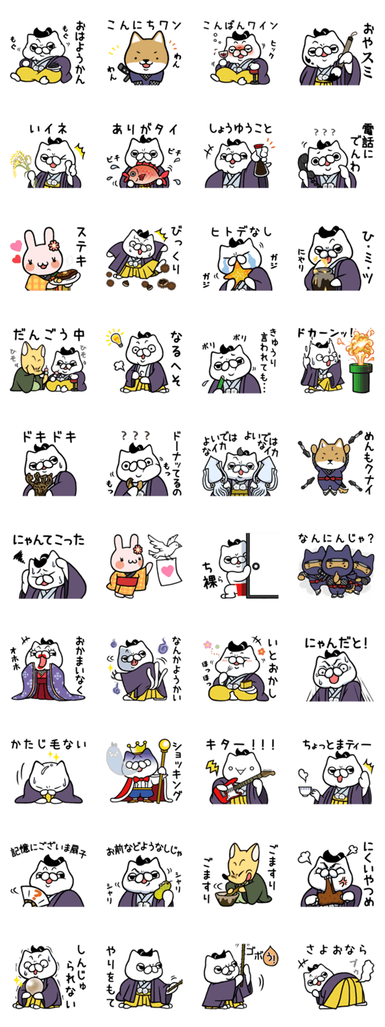 ねこの悪代官、きつねの商人、うさぎの町娘、犬の忍者が登場する、だじゃれ好き、おやじギャグ好きのための時代劇風スタンプです。