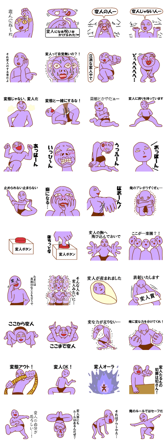 変人シリーズ第3弾。変人に困ってる人、変人を主張したい人に最適なスタンプです。ゲスネタを使いたい人もどうぞ。変態に対抗もできます。