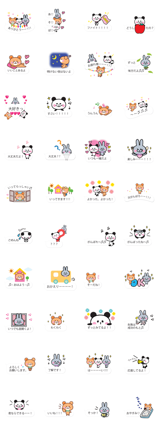 | スタンプ説明 | かわいいくま・うさぎ・パンダが吹き出しで応援や励ましメッセージを送ってくれます。日常で使いやすいワードも入ってます。 |