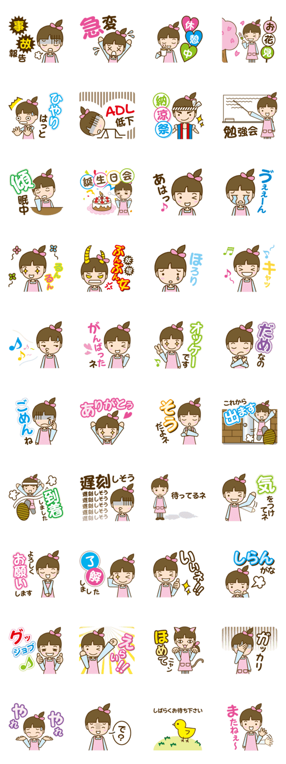 ゆるっと♪シリーズ第4弾「ゆるっと♪介護ちゃん」好評につきver2が登場!あいさつ・日常会話で和めるイラストですので楽しんでスタンプ使っていただけるとうれしいです♪