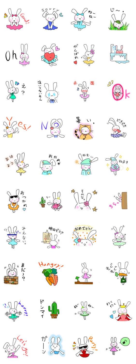 | スタンプ説明 | 長い耳、長い腕、長い脚。 超モデル体型のうさぎちゃんです。 「私はふわふわのドレスが好きよ」 |