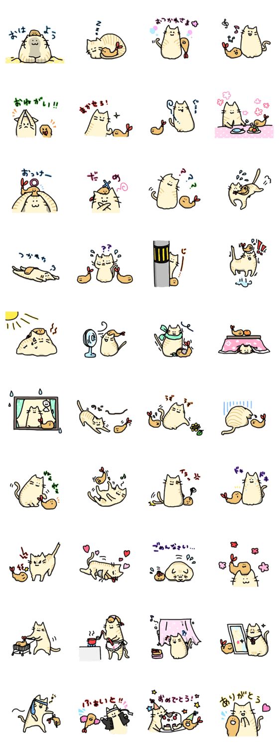 エビフライちゃんスタンプ第2弾です。今回は自由気ままなネコのチャコちゃんと一緒です。猫とエビフライによるゆるゆるな世界をお届けいたします♪