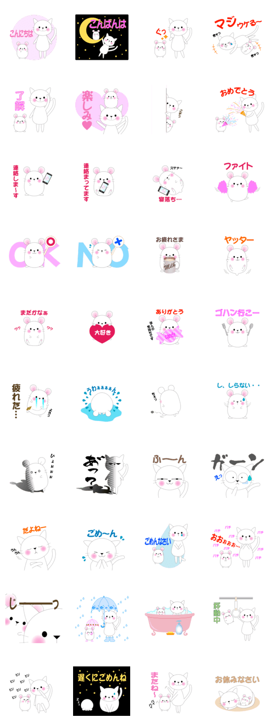 白いハムスターと白い猫の可愛いコンビのスタンプです。