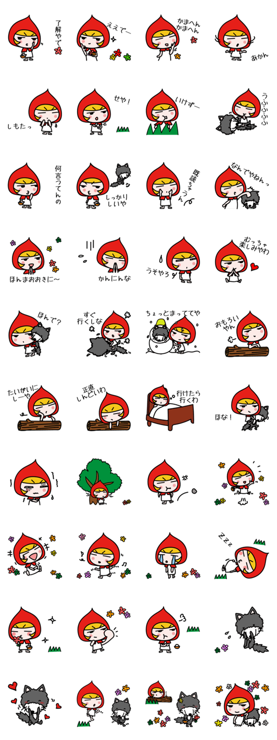 関西弁の赤ずきんちゃんと気弱な狼のスタンプ。普段使いにぴったりです。