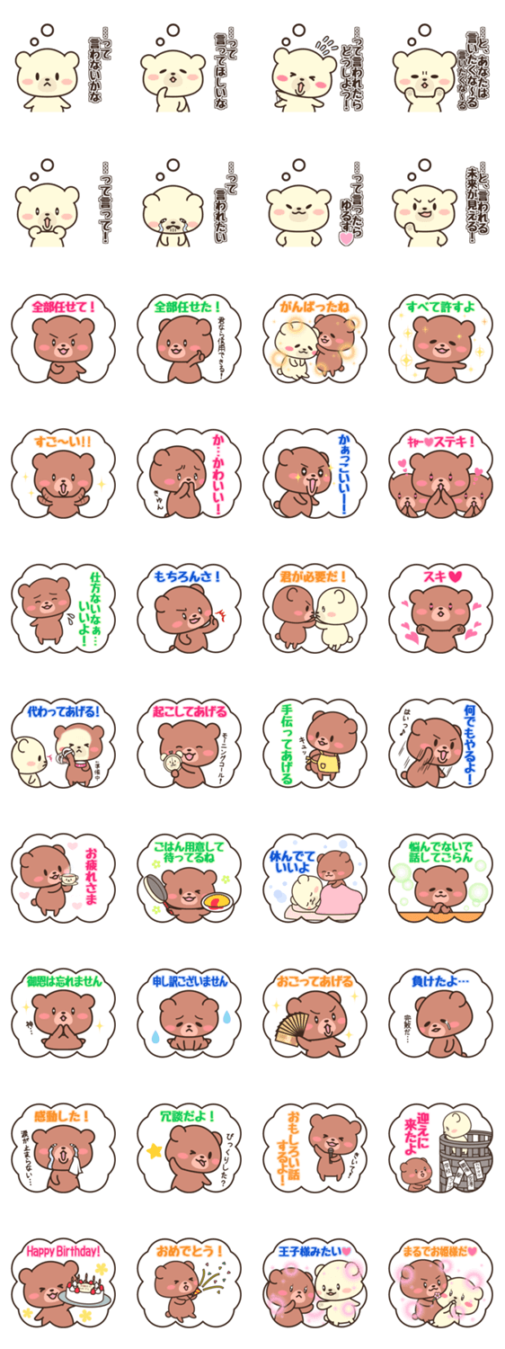 雲形枠の茶熊スタンプは単体でも使えますが、続けて白熊スタンプを合わせると妄想スタンプに早変わりします。妄想するときは「茶熊→白熊」の順に使ってください。