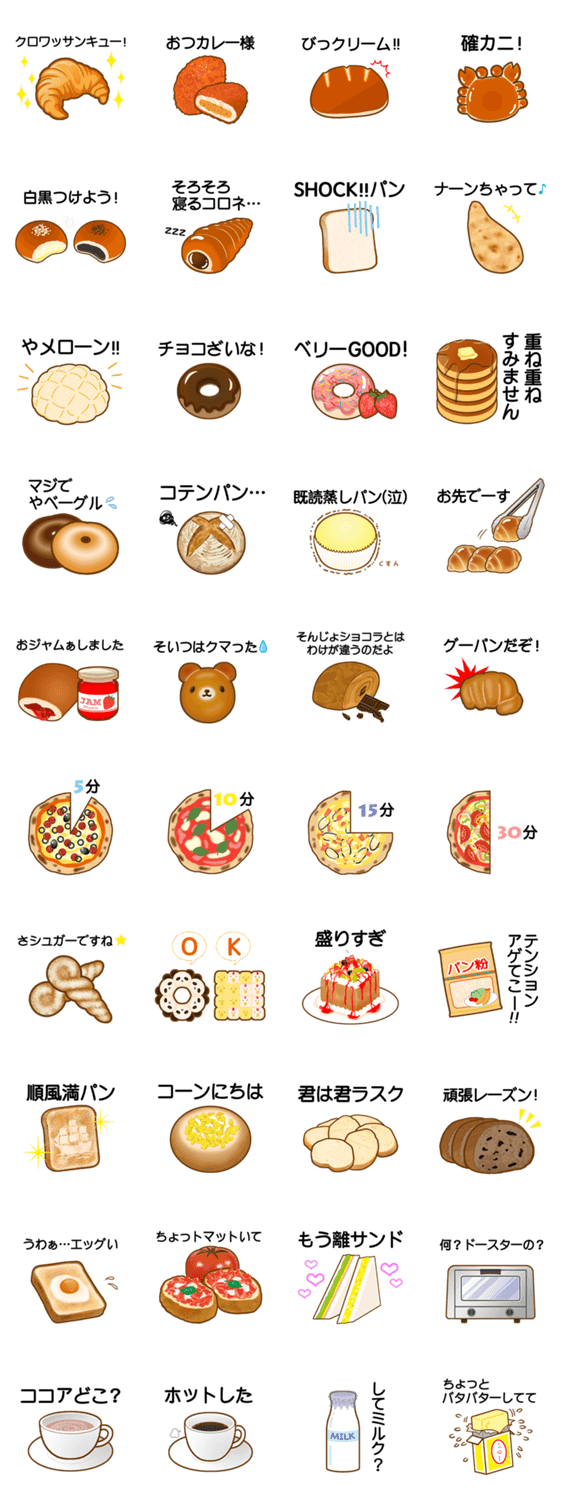 | スタンプ説明 | 美味しそうなパンを、ダジャレと共にいろいろと取り揃えました。ユーモアいっぱい、楽しく使える食べ物系スタンプです。 |