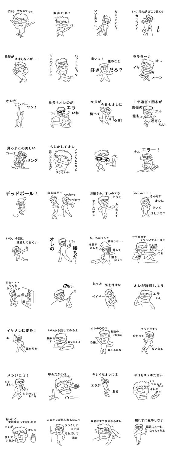オリジナル4コマ漫画「それいけかんちゃん」に登場するナルシストでエラの張ったナルエラのスタンプです。