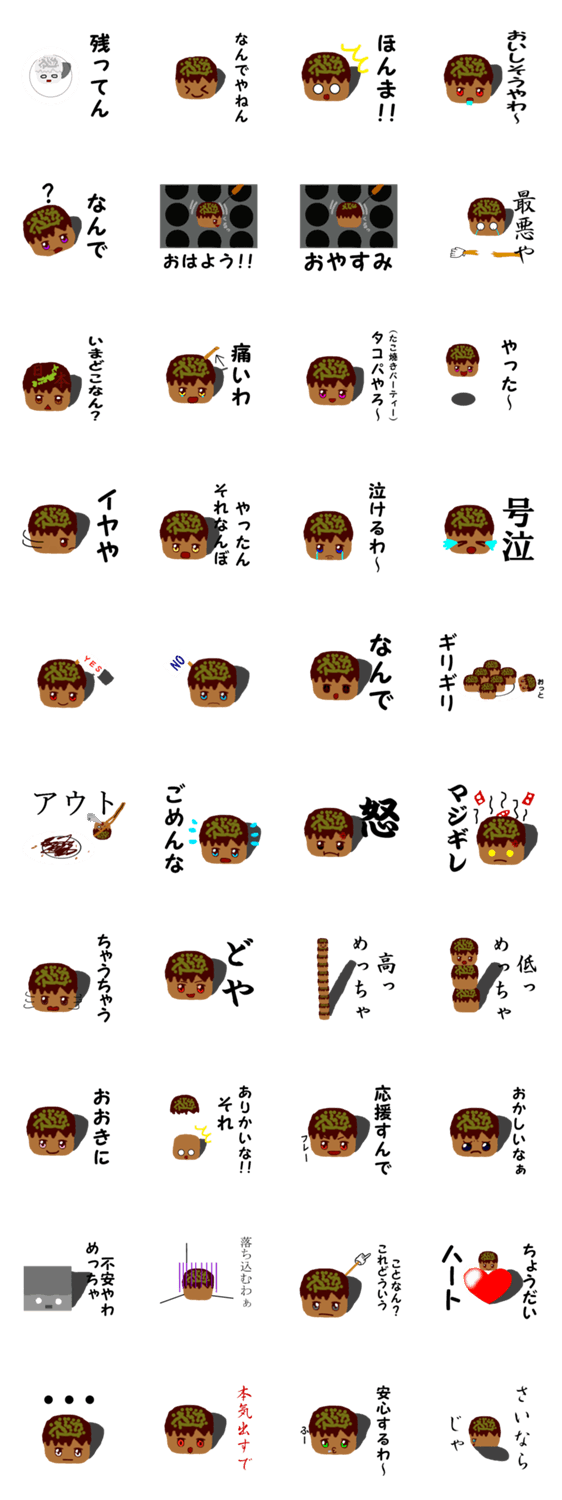 | スタンプ説明 | 普段から大阪弁を使っている人が「これは使える」と思う大阪弁のスタンプがたくさん入っています。(たこ焼きの感情によって瞳の色が変わります) |