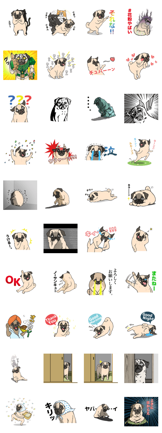 すべてのパグ好きに捧げる、究極のぱぐスタンプが登場!!よく使う言葉はモチロン、パグならではの(可愛い)白目や(愛らしい)変顔も多数収録。