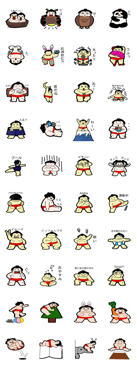 | スタンプ説明 | 力士の日々の会話。力士の日頃の会話や生活を描いた第二弾。様々な場面で力士をお楽しみください。 |