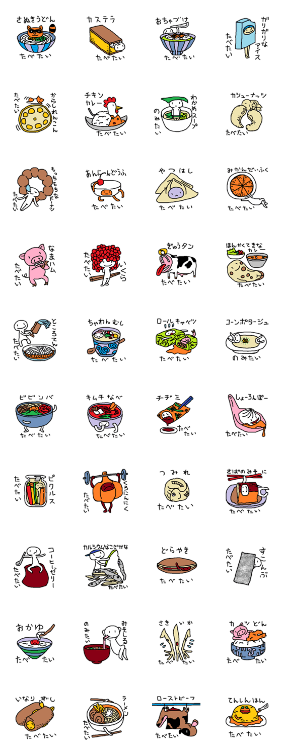 | スタンプ説明 | たべたいものスタンプの第5弾です。いつもとはちょっと違うものが食べたいなぁ、と思っているあなたにおすすめするスタンプです。ラーメンとカレーはもちろんあります。 |