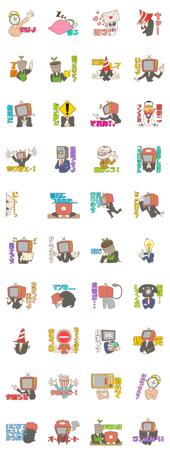 スタンプ説明 異形頭のテレビくんとそのお友達の日常スタンプ