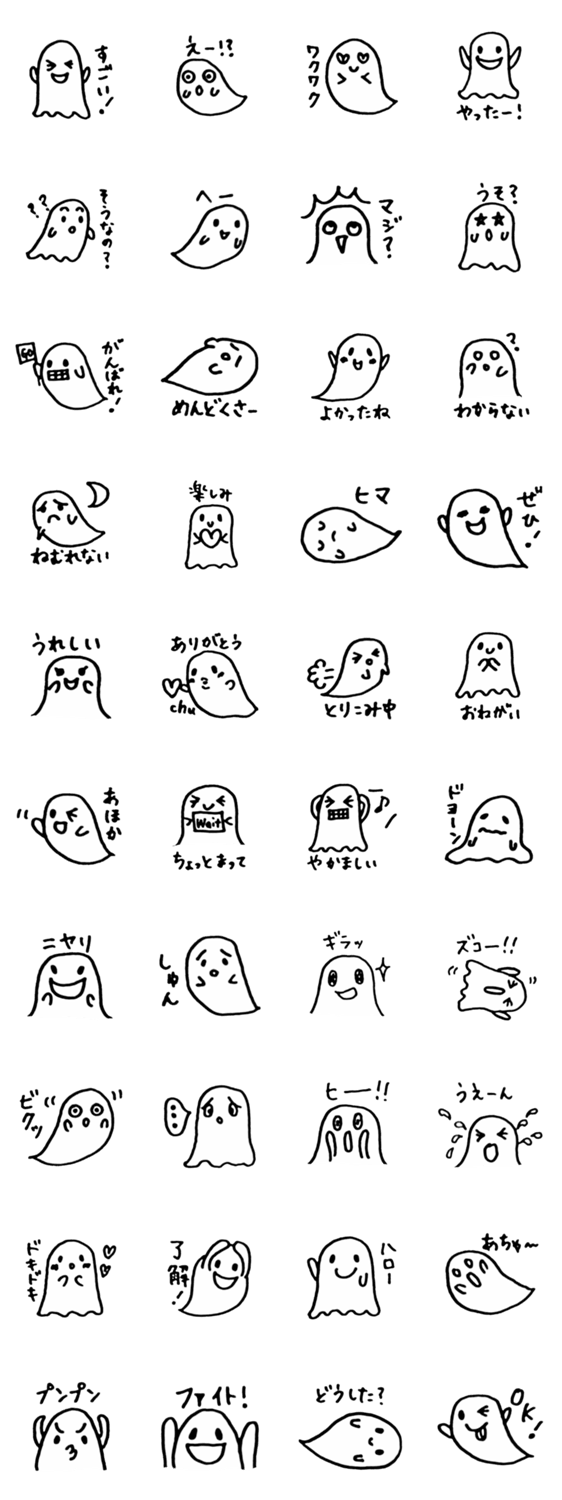 私が描いたおばけのステッカー。あいさつ、日常会話、リアクションなど。シンプルで使いやすいです。ハロウィンにも使えます。