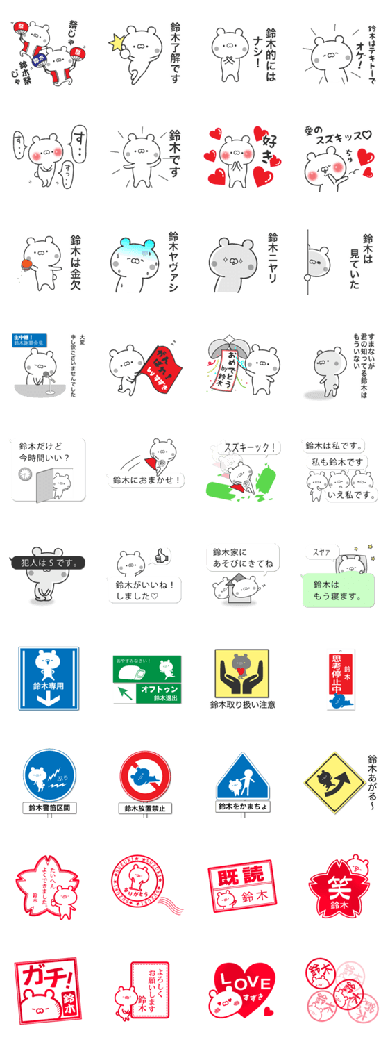 鈴木さんが使うスタンプです。吹き出し、はんこ、標識など、バリエーション盛りだくさんのセットです。ご家族や、お友達で使ってね!